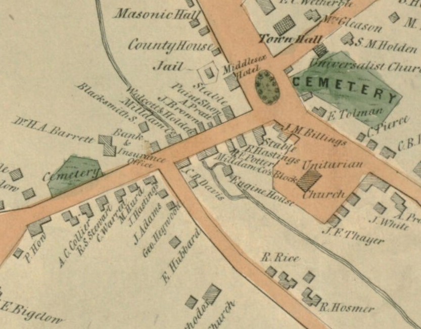 Image description: A color map of the Milldam area with roads highlighted in red and green spaces in green. Each business along Main Street is labeled, as well as the Town House, Middlesex Hotel, Unitarian Church (First Parish), and other well-known landmarks.