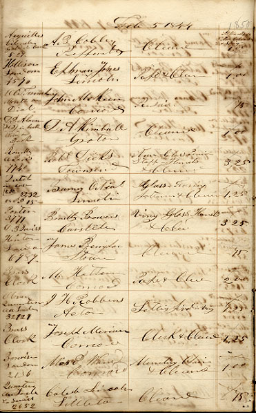 Image description: A handwritten account book showing various transactions for February 5th, 1844.