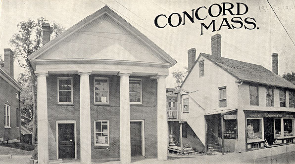 Image description: A black-and-white postcard photograph of Middlesex Savings Bank and Anderson Market. "Concord Mass." is printed in black text at the top right of the image.