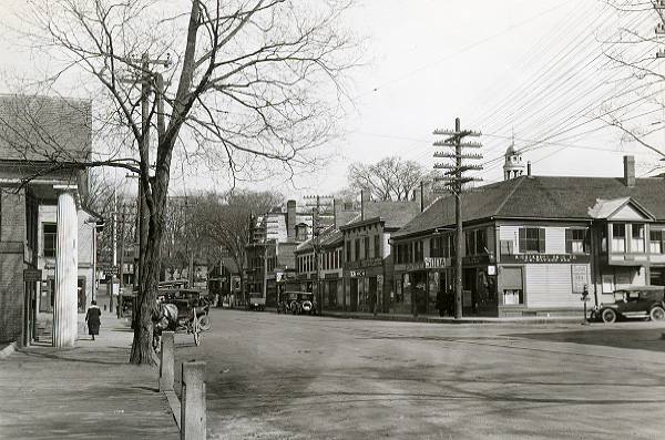 Image description: A black-and-white photograph of the Milldam taken from the left side of the street near the intersection of Main Street and Walden Street.