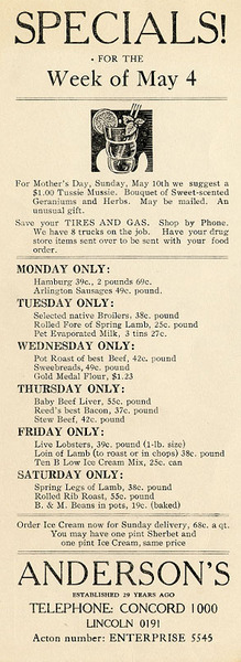 Leslie attended Concord schools and the University of Massachusetts (then Massachusetts State College). He served in World War I as a member of the Neuropsychiatric Unit of the U.S. Army Medical Corps. In 1920, he married Esther Howe Wheeler, uniting two prominent, civic-minded Concord families. The Andersons lived on the Wheeler Farm for many years with their three children. Leslie also belonged to a number of local organizations, including Rotary, the Elks, the American Legion, the Massachusetts Retail Grocers' Association, and the Concord Chamber of Commerce. He was also active in Milldam affairs.