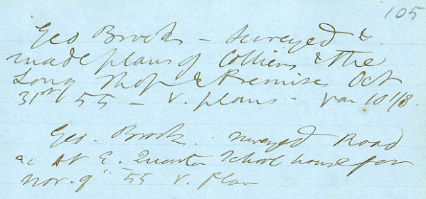 Henry David Thoreau took up land and property surveying in the 1840s, and worked for both private property owners as well as the town. The Concord Free Public Library holds nearly two hundred of his surveys, as well as related field notes and papers. This entry from Thoreau's field notes was made on October 31st, 1855, and records his work for Concord attorney George Brooks. Brooks represented A.C. Collier in a suit against neighboring business owner Cyrus Pierce. Documentation suggests that Thoreau's surveys on these properties were commissioned for the court case, which went to trial in October 1856.