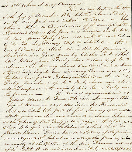 This certificate of sale documents Calvin Carver Damon's purchase of the mill from James Derby in November 1834 for the sum of $18,000. Damon found an outlet for his products by partnering with James Johnson, who was head of Johnson, Sewall & Company, a Boston commission house.