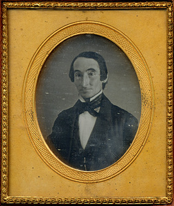 Image description: A black-and-white daguerreotype portrait of a man with dark hair. The oval-shaped portrait is framed by a gold case.