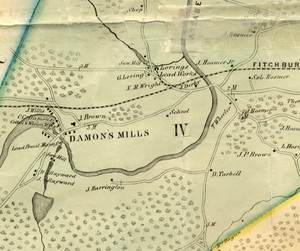 Image description: A color map of the Damon Mill area. Various homes and businesses are labeled on the map, as is the railroad.