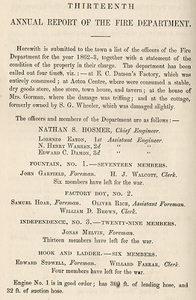 Herewith is submitted to the town a list of the officers of the Fire Department for the year 1862-3, together with a statement of the condition of the property in their charge. The department has been called out four times, viz :— at E. C. Damon's Factory, which was entirely consumed; at Acton Centre, where were consumed a stable, dry goods store, shoe store, town house, and tavern; at the house of Mrs. Gorman, where the damage was trifling; and at the cottage, formerly owned by S. G. Wheeler, which was damaged slightly.