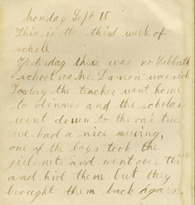 Yesterday thear [sic] was no Sabbath school as Mr. Damon was sick. Today the teacher went home to dinner and the scholars went down to the oak tree. We had a nice evening, one of the boys took the girls nets and went over the hill and hid them but they brought them back again.