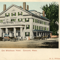 Image description: A color illustration of a photograph of the Middlesex Hotel. The image shows the Middlesex Hotel from its left side, with many people in carriages visible. Below the image is the following in red text: "Old Middlesex Hotel, Concord, Mass." In the bottom right corner is the following text in red: "H. L. Whitcomb, Concord, Mass."