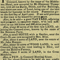That noted TAVERN, situated in the middle of Concord, known by the name of the Middlesex Hotel, now occupied by Mr. Ebenezer Thompson, with all the Barns, Sheds, and Out Buildings, and about oneacre of Land, being one of the best stands for business in the county. Possession given the first day of April next. If not sold previous to that time to be leased for seven years.