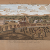 Image description: A color engraving of the Town of Concord as it looked in 1775. The cemetery (Old Hill Burying Ground) is in the foreground with two British soldiers standing among the gravestones. Behind the stone wall is what would eventually become Monument Square with regiments of British troops marching through. Roads, buildings, and the old Mill Pond are visible in the background beneath a blue sky. Above the top edge of the image, the following text is written in black ink: "Plate II. A View of the Town of Concord." Throughout the image, various locations and scenes ar labeled with numbers. Below the image, a guide to the numbers is written in black ink: