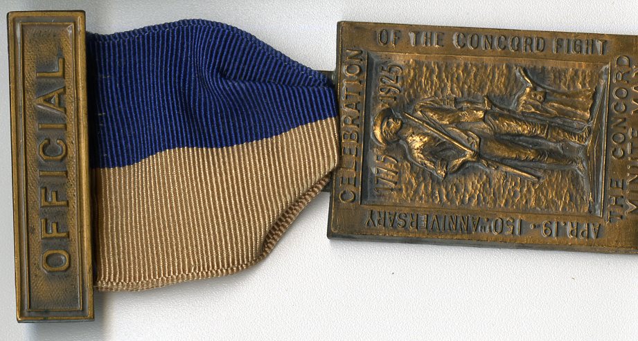 This medal was worn by officials participating in the 150th anniversary celebration of the Concord Fight in 1925, featuring an image of the Minute Man statue as the centerpiece.