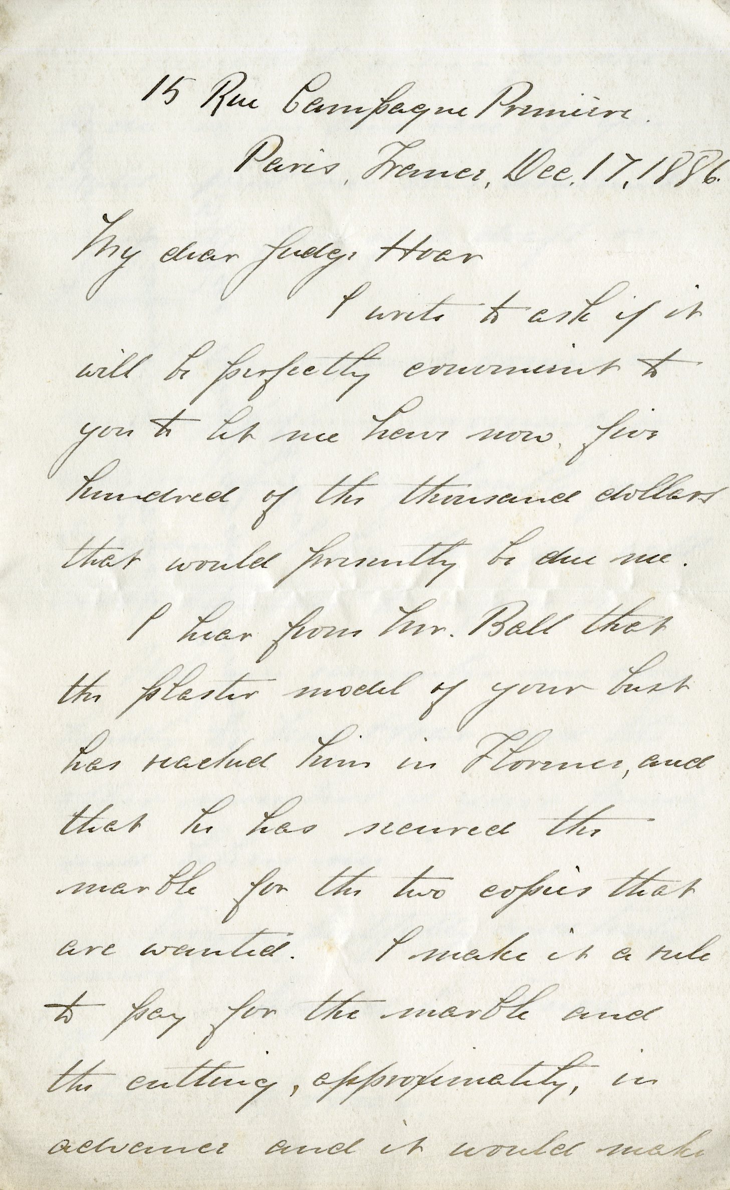 I hear from Mr. Ball that the plaster model of your bust has reached him in Florence, and that he has secured the marble for the two copies that are wanted. I make it a rule to pay for the marble and the cutting, appropriately in advance and it would make...