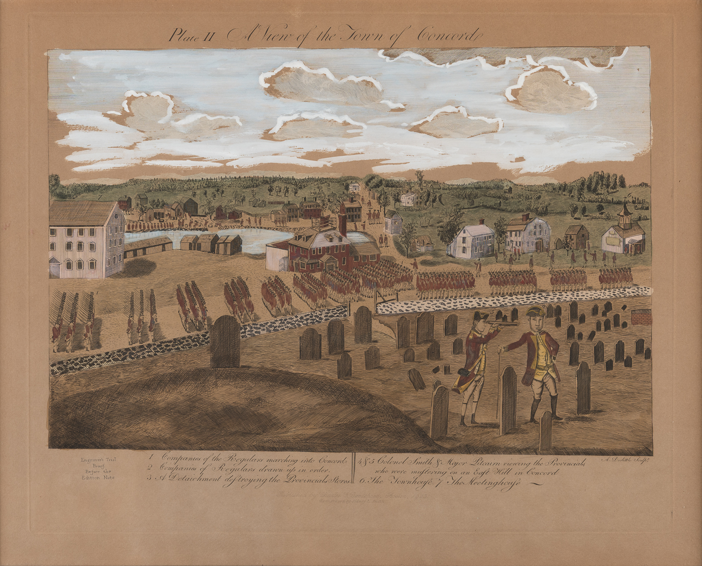 Image description: A color engraving of the Town of Concord as it looked in 1775. The cemetery (Old Hill Burying Ground) is in the foreground with two British soldiers standing among the gravestones. Behind the stone wall is what would eventually become Monument Square with regiments of British troops marching through. Roads, buildings, and the old Mill Pond are visible in the background beneath a blue sky. Above the top edge of the image, the following text is written in black ink: "Plate II. A View of the Town of Concord." Throughout the image, various locations and scenes ar labeled with numbers. Below the image, a guide to the numbers is written in black ink: