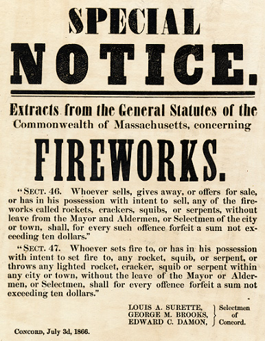 “Concord Board of Selectmen 1866 Broadside Regarding Sale and Use of Fireworks,” William Munroe Special Collections at the Concord Free Public Library, accessed January 15, 2026, https://mail.sc.concordlibrary.org/items/show/4945.