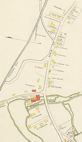 Image description: A hand-colored map of the Damon Mill area. The map shows various buildings and the names associated with them, the Assabet River, the mill, and the railroad.