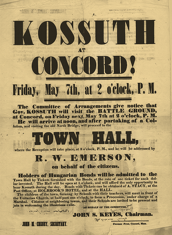 “Kossuth at the Town Hall 1852 Broadside,” William Munroe Special Collections at the Concord Free Public Library, accessed January 26, 2026, https://mail.sc.concordlibrary.org/items/show/5020.
