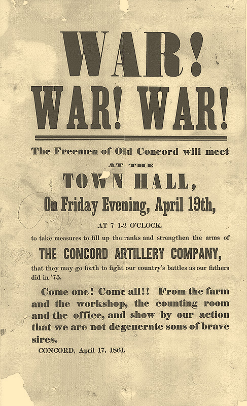 The Freemen of Old Concord will meet at the Town Hall, On Friday Evening, April 19th, at 7 1/2 o'clock, to take measures to fill up the ranks and strengthen the arms of the Concord Artillery Company, that they may go forth to fight our country's battles as our fathers did in '75.