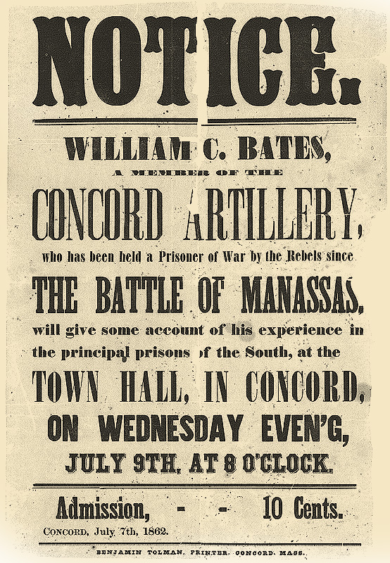 William C. Bates, a member of the Concord Artillery, who has been held Prisoner of War by the Rebels since