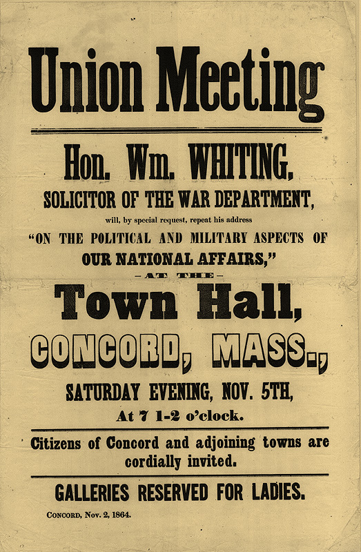 Broadside advertising 1864 union meeting at Concord Town Hall with William Whiting as speaker.