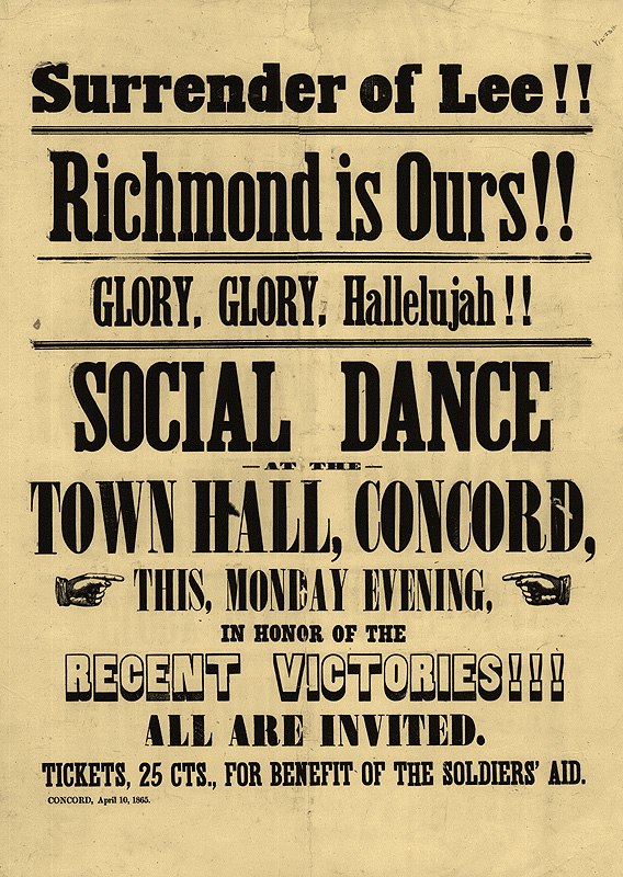 This Concord broadside announces a celebratory dance in the Town Hall the day after General Robert E. Lee's surrender in 1865.