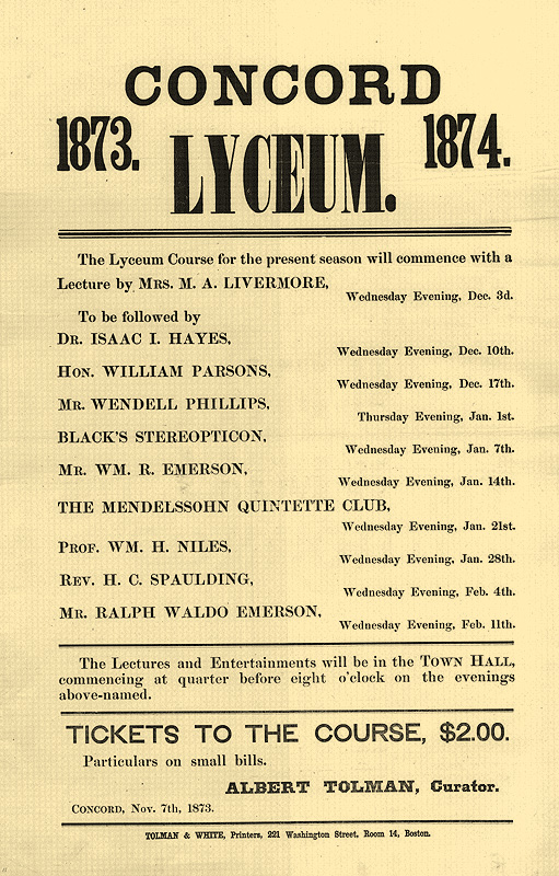 “1873-74 Lyceum Programs at Concord's Town Hall Broadside,” William Munroe Special Collections at the Concord Free Public Library, accessed January 26, 2026, https://mail.sc.concordlibrary.org/items/show/5030.