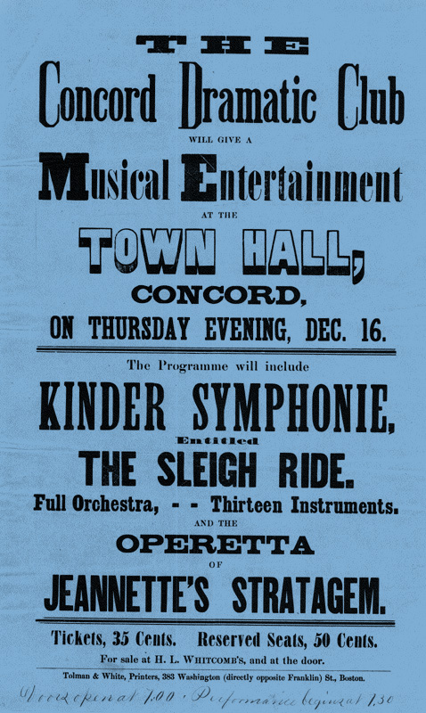 Broadside advertising a Concord Dramatic Club program at the Town Hall in 1875.