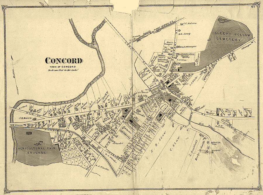 Image description: A black-and-white map of the center of Concord, with the Agricultural Fairgrounds at the very west and Sleepy Hollow Cemetery at the very east. Most main streets in downtown Concord are marked, as are most businesses.