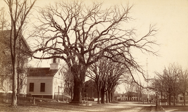 Image description: A black-and-white photograph of Monument Square taken from the middle of the square facing Lexington Road. The Town House and Catholic church are visible on the left. A large, leafless trees splinters the white sky near the center of the image.
