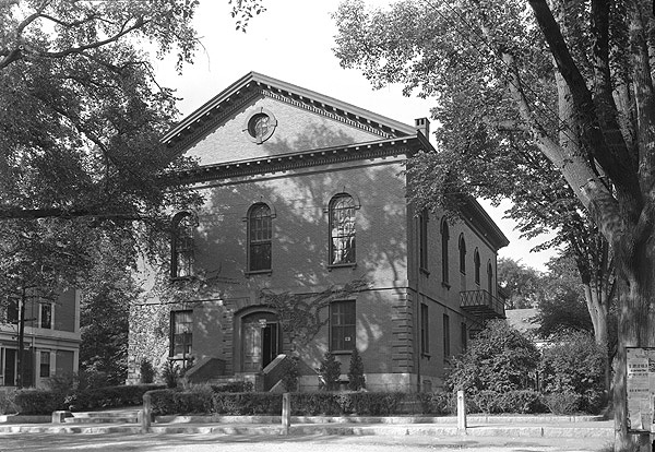 Image description: A black-and-white photograph of the Town House taken from Monument Square. The brick building has a small growth of ivy to the right of the front door. Large trees on either side cast shadows on the building.